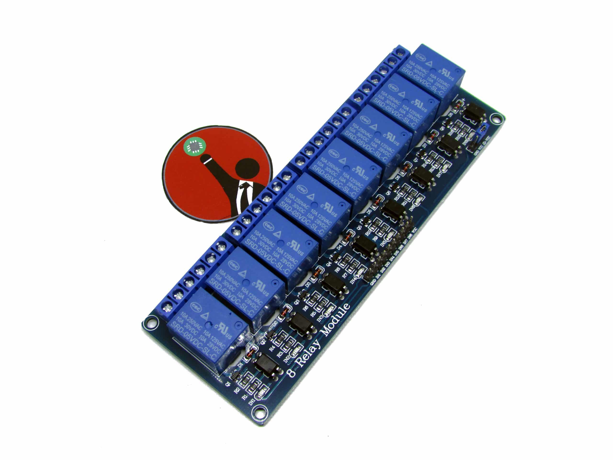 Este módulo es capaz de controlar elementos eléctricos que funcionan con tensiones y corrientes más altas de las que puede manejar un circuito electrónico. Este producto, en particular de 8 canales (8 Relés), posee componentes ópticos que permiten aislar eléctricamente la etapa de control de la de potencia, dando como resultado un diseño que protege a los elementos de la etapa de control.